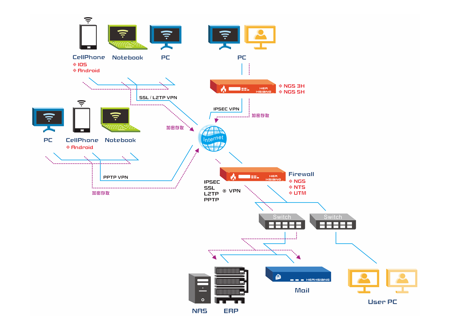 PC/NB/手機都可透過VPN加密連線連回公司內網伺服器處理公司事宜,