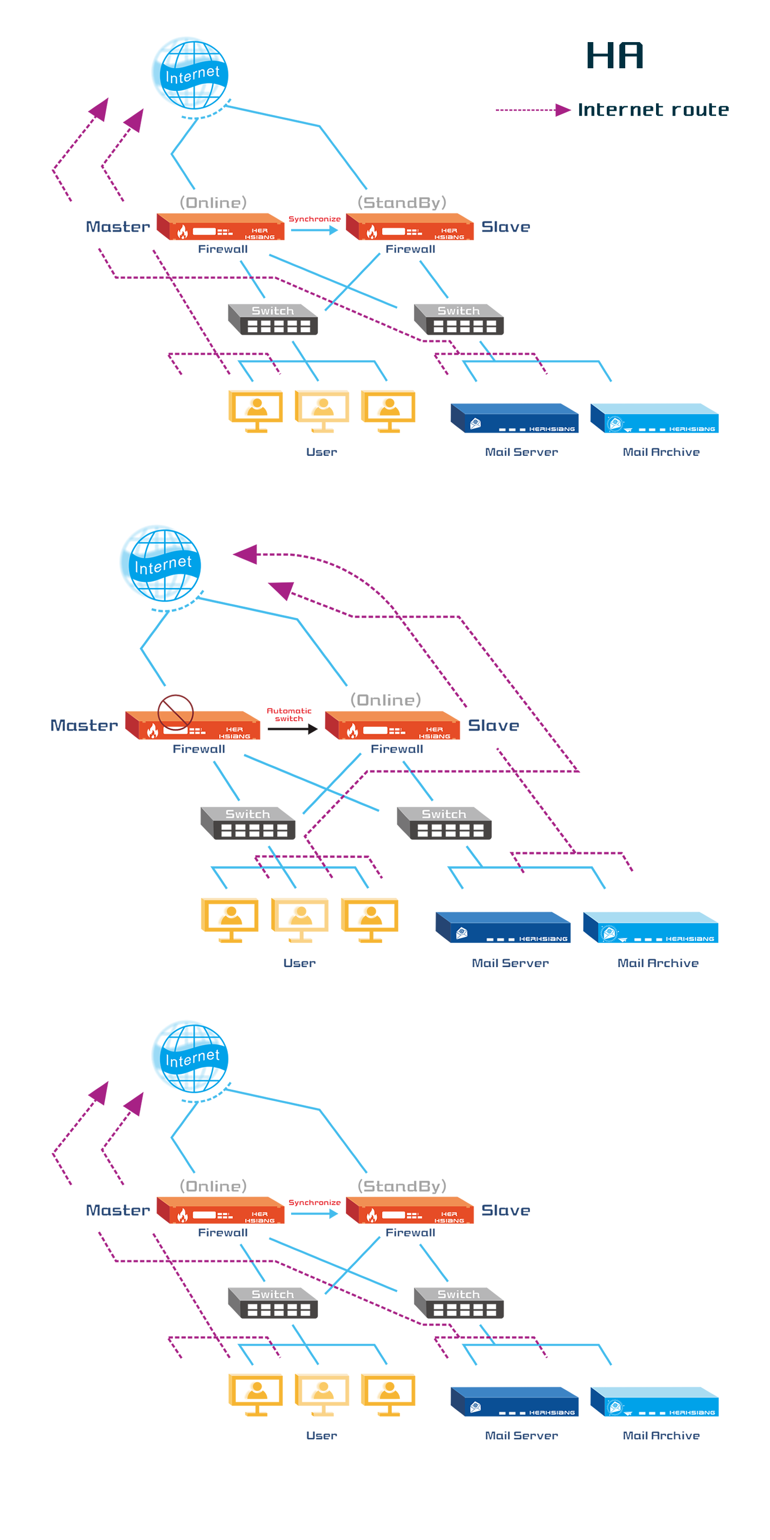 提供Outbound 和Inbound負載平衡,提供多種負載平衡演算法則,當其中一條線路斷線之後,所有的網路封包會自動轉向另一條正常的線路,確保內部的用戶網路暢通,當線路恢復之後,封包又會自動分配。
