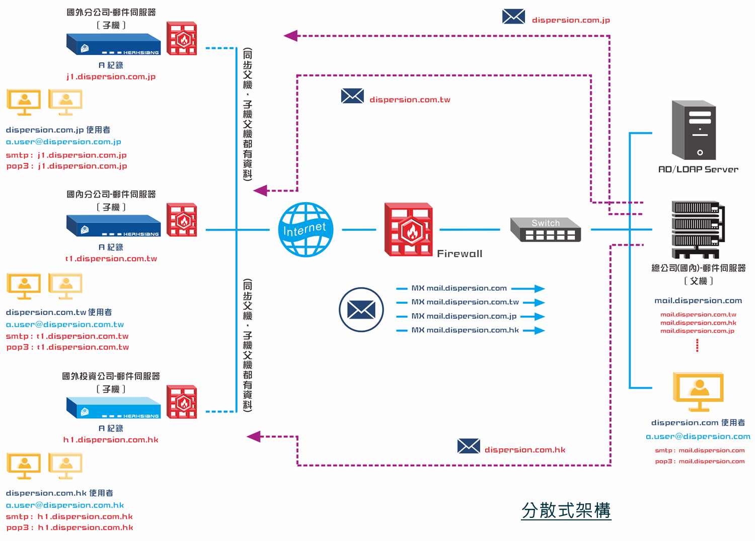 而異地備援是在總公司與分公司建置一台專屬的郵件主機,當任何一地的郵件主機發生故障時,系統可以自動切換到另外一台主機上保持運作,對於企業收發郵件不會有中斷的困擾,做到真正異地備援服務。