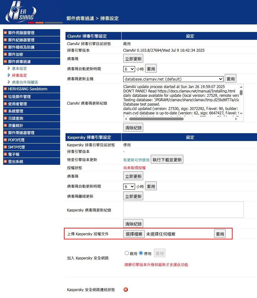 請登入管理介面後至以下圖片位置將採購的授權檔匯入, 即可啟用卡巴防毒引擎增加病毒安全防護.