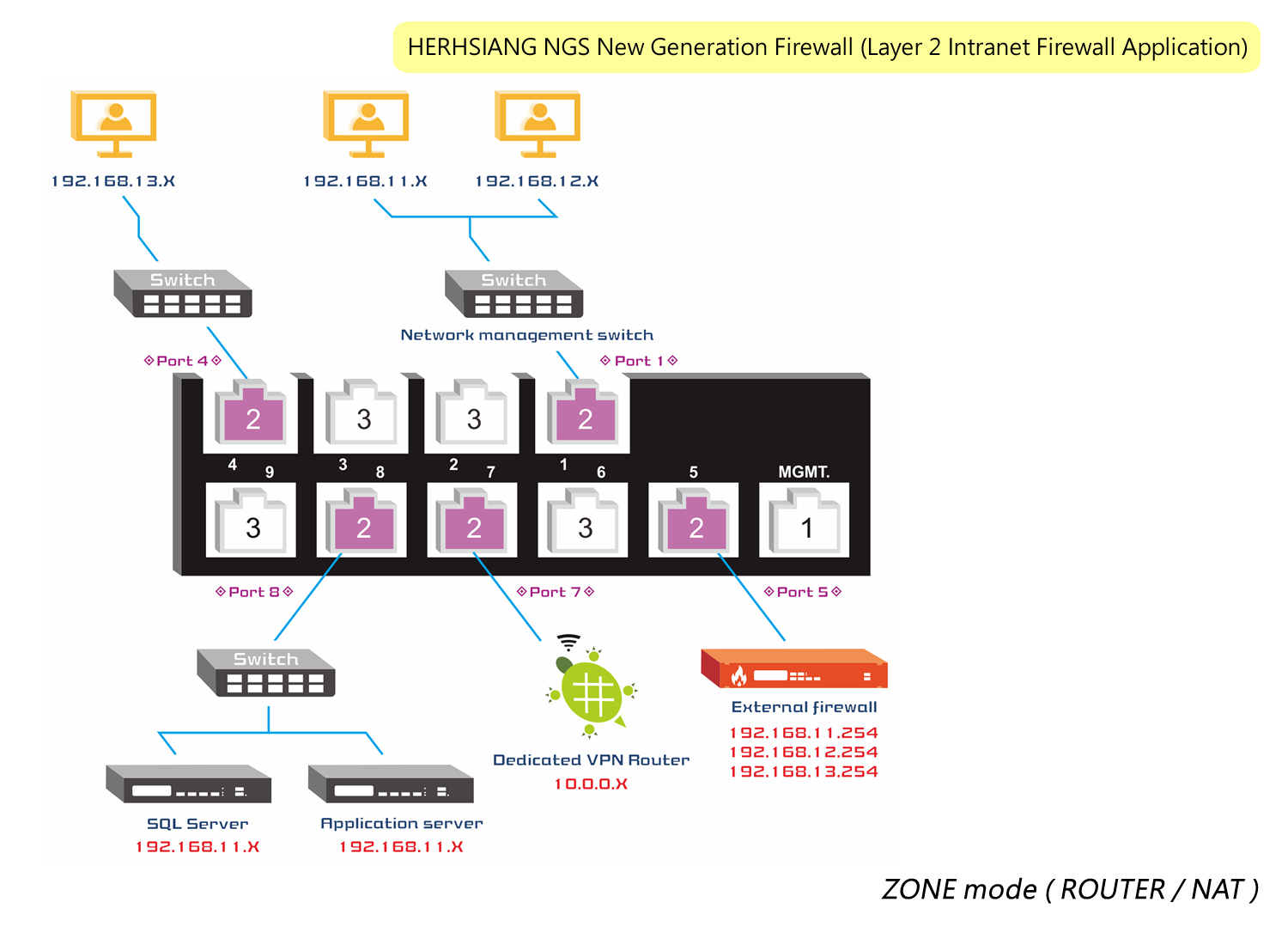 ZONE 2 group (purple block): Port 1 / 4 / 5 / 7 / 8, IP / MAC / PORT, if they do not communicate with each other, they need to open control regulations to pass. (Support routing / NAT)