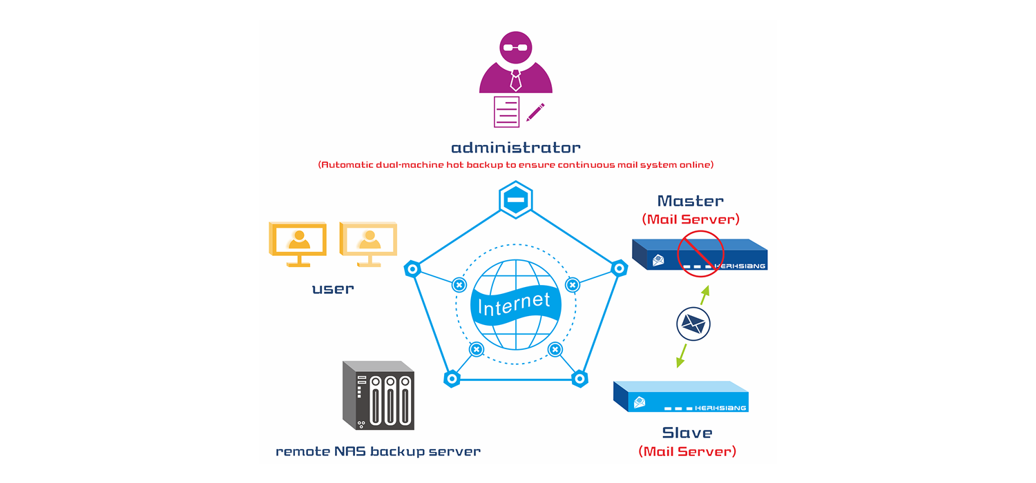 "Creating a never-ending network", dual-machine backup allows the main mail host of an enterprise to stop working when there is an abnormal operation. The backup mail host will automatically take over as the main mail host, allowing the corporate mail host to stay on for 24 hours. working normally. The off-site backup is to set up a dedicated mail host in the head office and the branch office. When the mail host fails in any place, the system can automatically switch to another host to keep it running. There are interruptions, and truly offsite backup services are available.